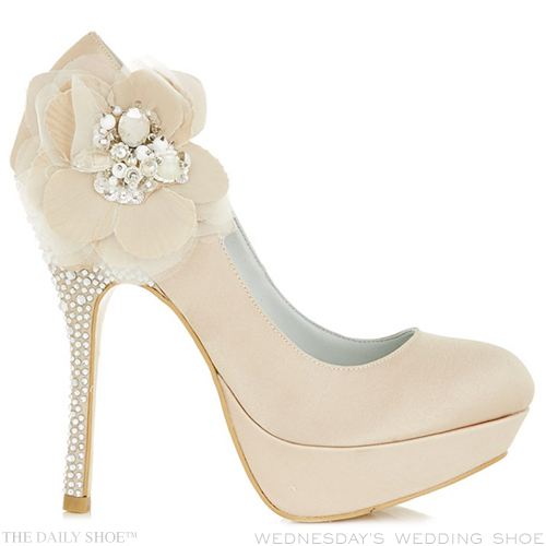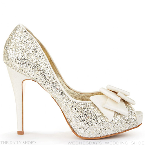 THE DAILY SHOE REVIEW – Silvery, glittered satin & leather body, a white three tiered front bow and covered heel, peep-toe and 4 inch heels, this is an inspired choice as a wedding shoe. To be worn with pride and confidence for that glorious march down the aisle on your very special day. Click to Shop : […]