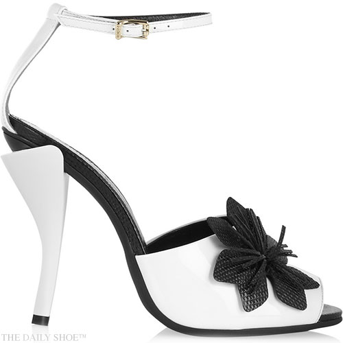 Love these?… What do you think?… LEAVE A COMMENT Flower-appliquéd patent-leather sandals by FENDI “These white patent-leather sandals are adorned with a black 3D flower appliqué in perforated leather. The buckled ankle strap might be narrow, but it’s placed for maximum support too.” –