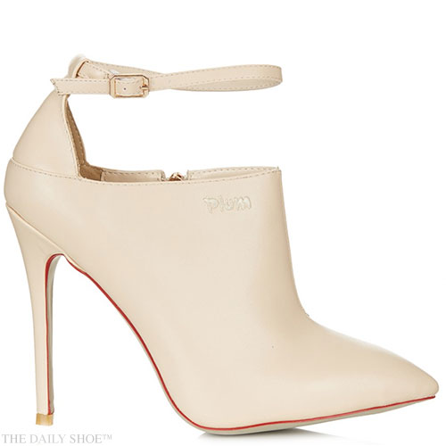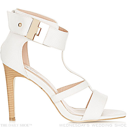 “This open stiletto has a leather like finish and bulky gold buckle which conveys her simplicity and extravagance. Cara is toned down, yet picturesque.” – Plum ‘CARA’ WHITE STILETTO